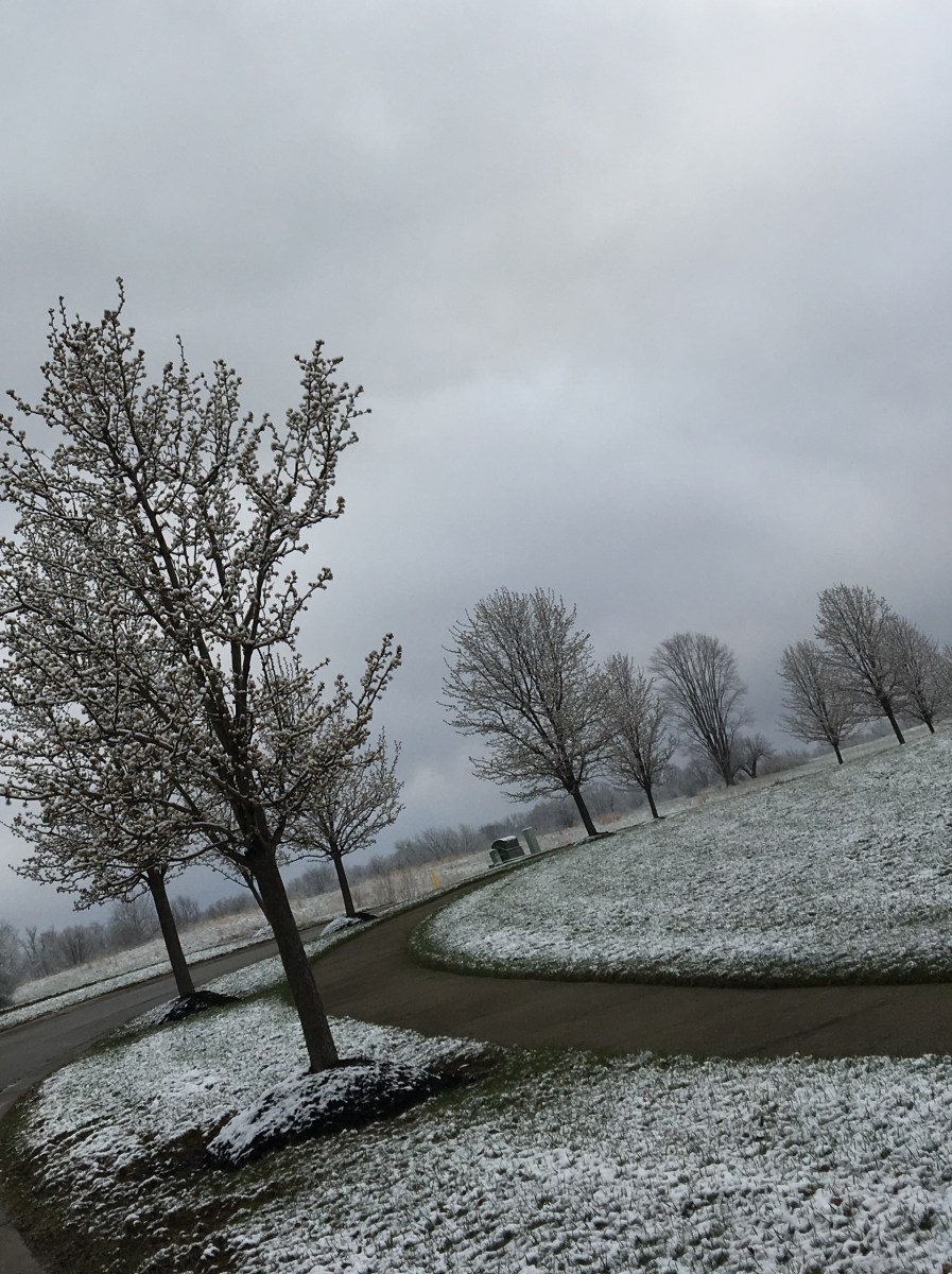 Home » Waiting for Spring » week 2 flowing trees with snow on the white flowers