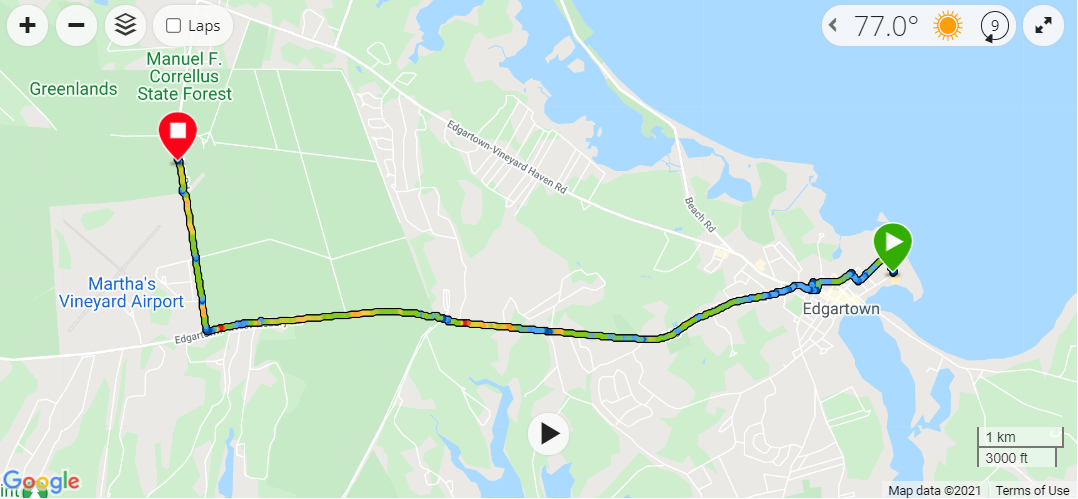 All told I rode about 25 miles during the day and only got turned around a few times trying to make it back to the ferry on time from the airport. My travel was a triangle from Oak Bluffs to Edgartown and up to the center of the island to play disc golf and back to the ferry landing.