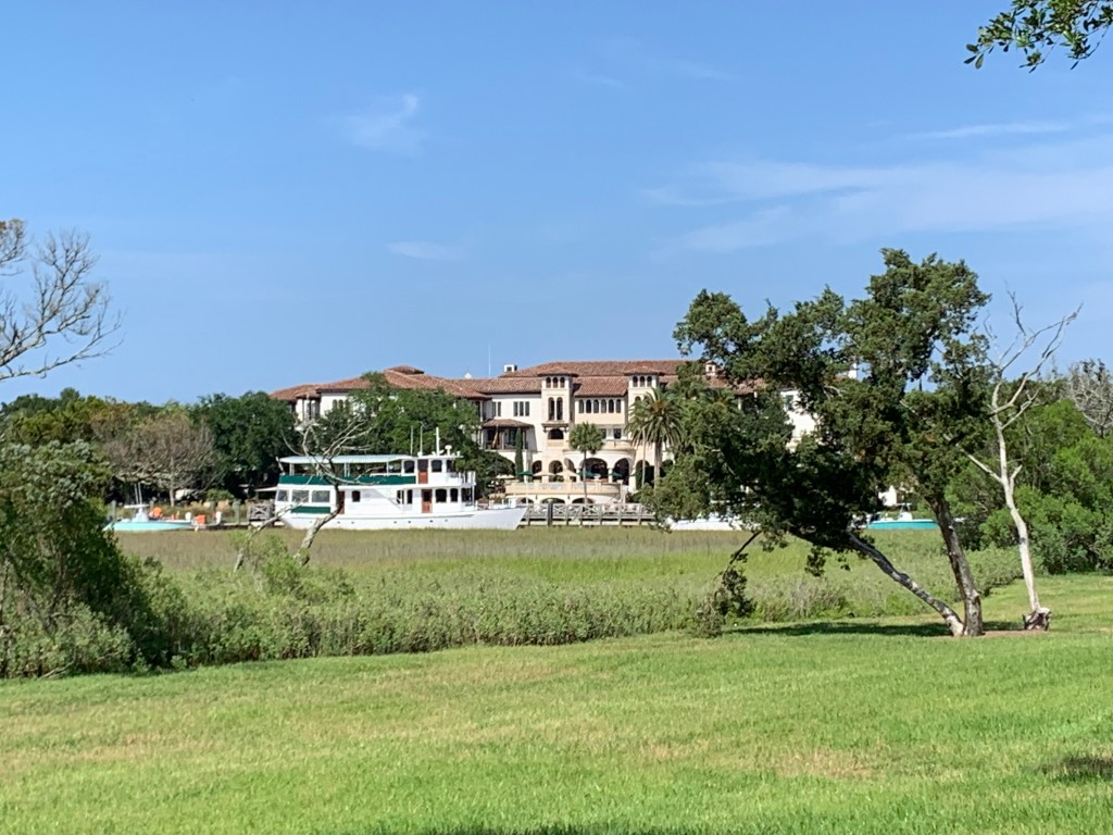 We were delighted to ride our bikes from the hotel on St. Simons Island onto Sea Island. We rode across the causeway to the island. I always think that you have to go across a “big body” of water to have an island. However, that is not the case. I found out that many of the Golden Isles are close to each other and only separated by small inlets and rivers.