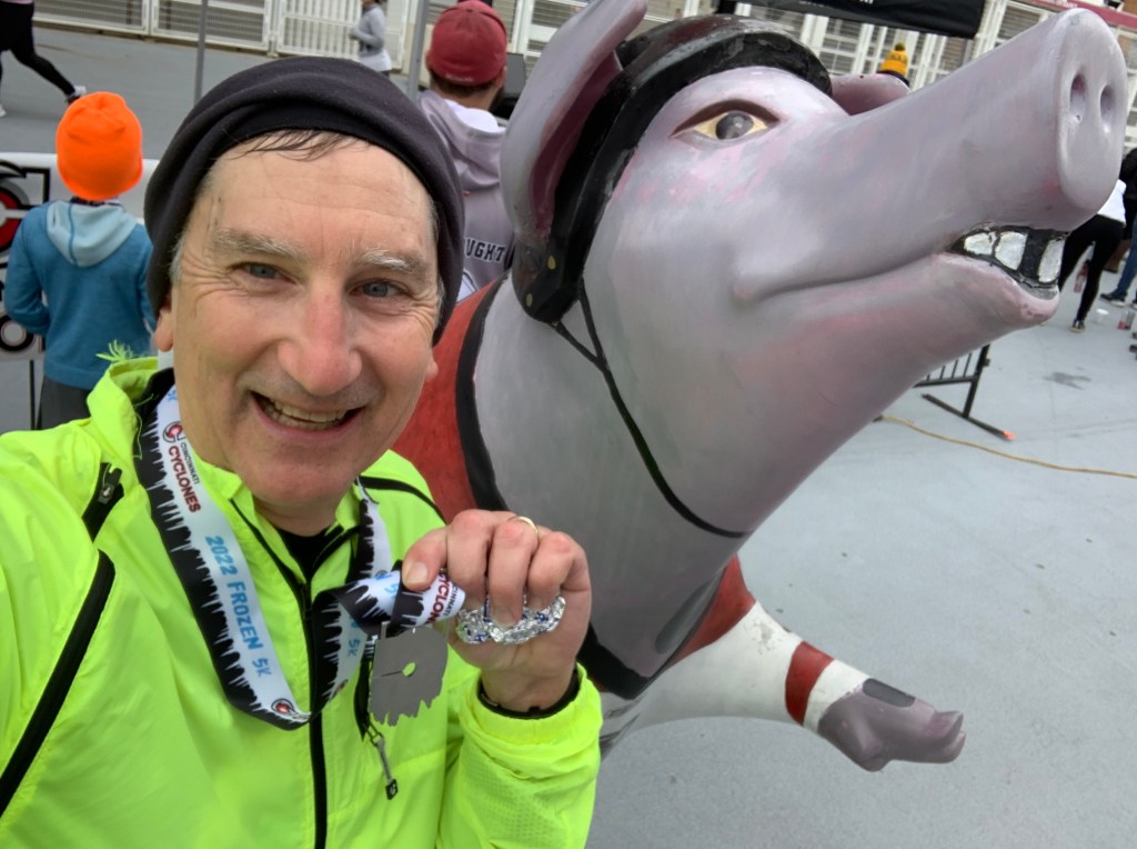 The training surprise for me was that the only event from the 2020 training plan I did in-person was postponed 3 weeks in 2022 as the weather was too cold and “frozen” on the planned race day in early February. The Frozen 5k put on by the Cincinnati Cyclones  originally fit in nicely to our training program. The revised event pushed onto the training program created “the need” for a 9-mile run that weekend. My coach, and most of the others in our training group, weaved in a 9-mile run with the 5k event. We finished the last mile running back to our starting point in Kentucky. I had never done a “race” with a 5-mile warm-up run prior to the start.