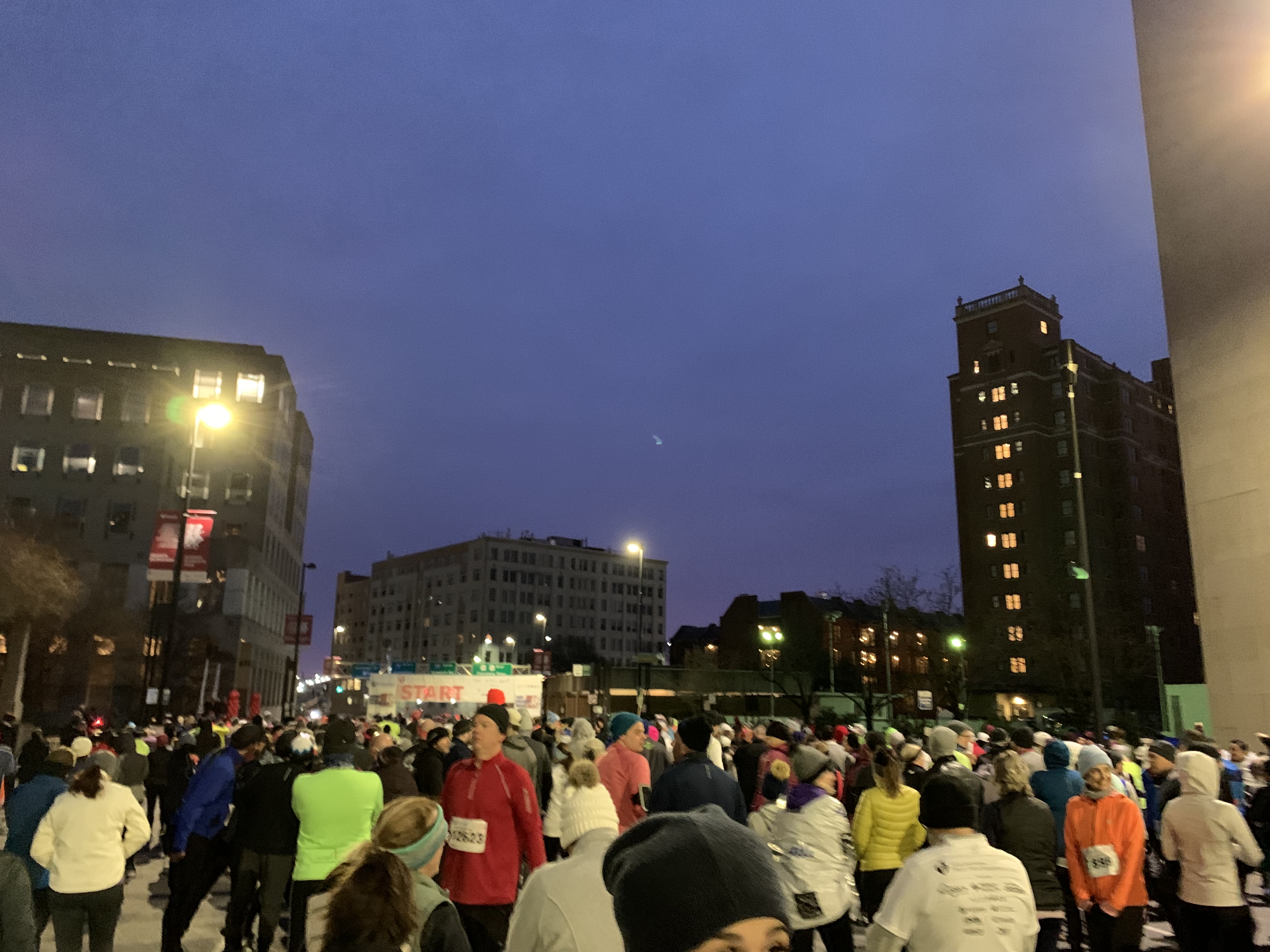 In preparing for the run, I realized that one of my running problems is starting too quickly. I really enjoyed the large crowd at the start of the Heart Mini because the crowd of runners and some walkers forced me to slow down at the beginning. The same thing happened on the marathon day as we started 11 minutes after the official start due to the large number of people running faster than I can. Others behind us took even longer to get to the starting line. We were so far away from the start that we did not hear the announcements. I think there were about 10,000 runners between the half and full marathon participants.