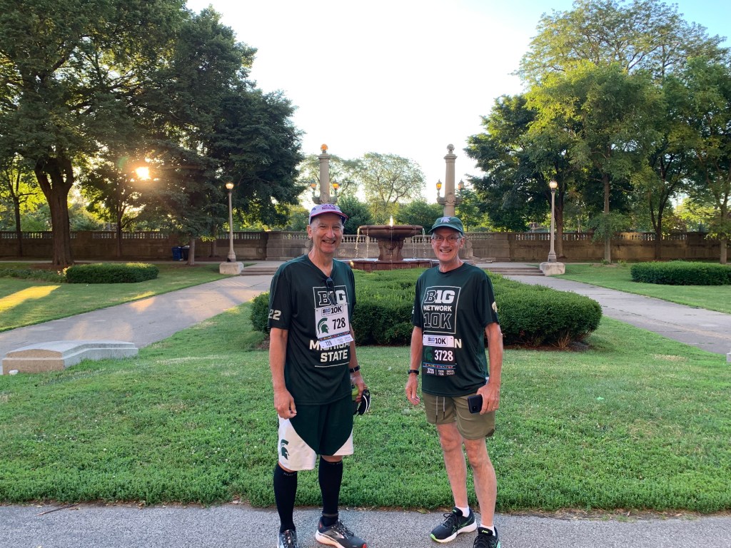 In 2021, I ran this run virtually on the campus of Michigan State University in celebration of my graduation 40 years prior. That was the second year I had run this 10k virtually. 2022 was the year to return to in-person running, so we needed to go to Chicago and run the event. Bill was in, and we joined together for the Big Ten Network 10k run in downtown Chicago.