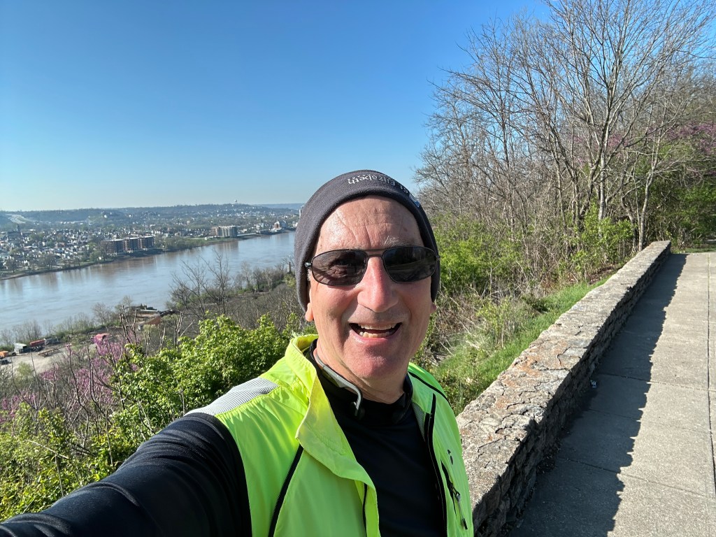 We did a long practice run in mid-April, running most of the course with the running group. Here I am overlooking the Ohio River. I went by this spot on the event but did not stop to take a picture during the race.