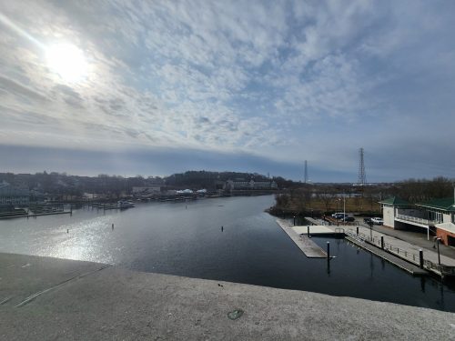 In February, we stopped to take a driving break at the West Branch State Park near Ravenna, OH, on the west branch of the Mahoning River. It was good to enjoy a walk and stretch our legs. It was near sunset and cold, and it did make us appreciate the partially frozen water on our walk around the boat dock.
