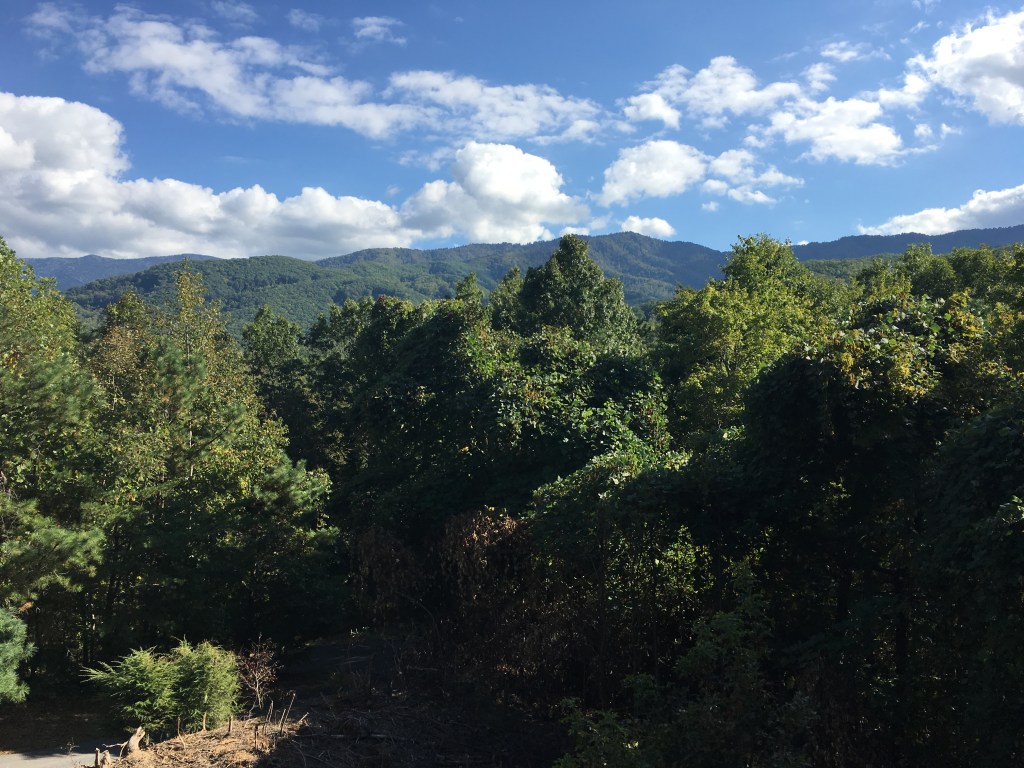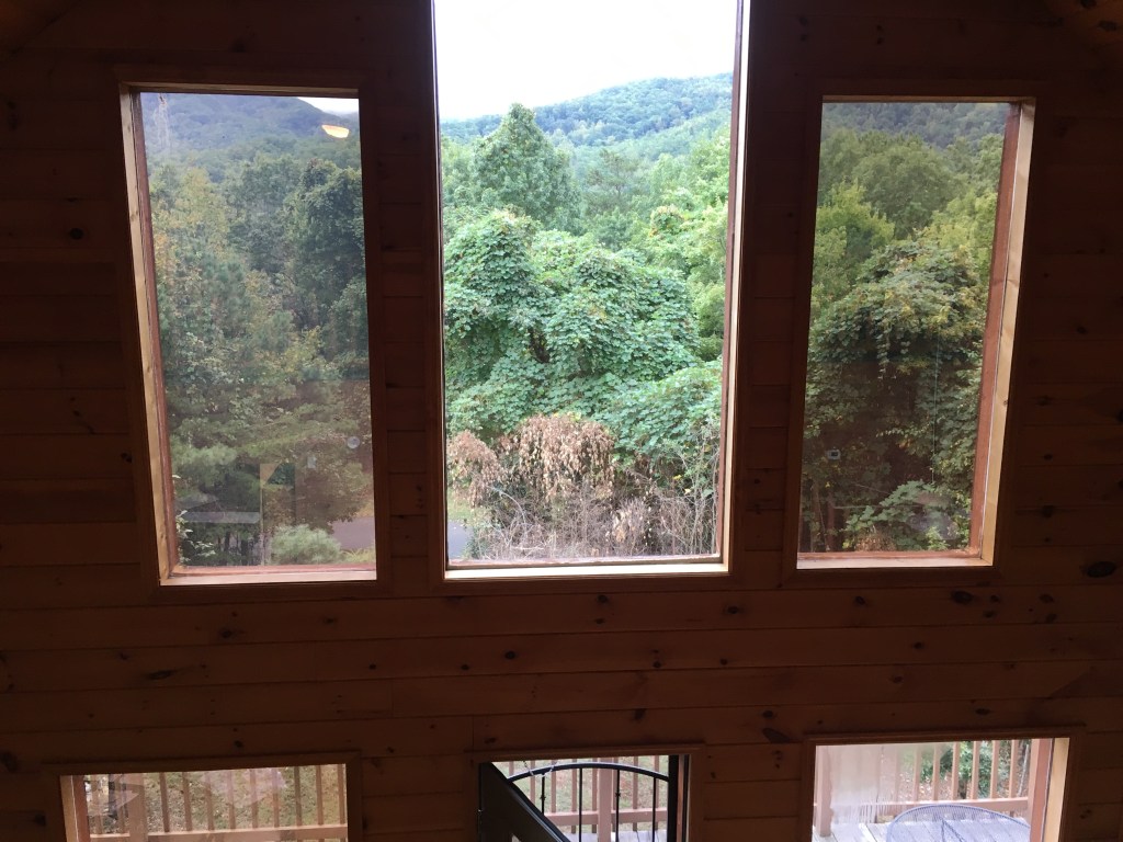 We had a cabin away from town and up a hill so we could enjoy breakfast and linger a little out the front porch. The cabin had large windows and offered a great view of the mountains. We did see the “smoke” in the mountains in the morning that looked inviting.